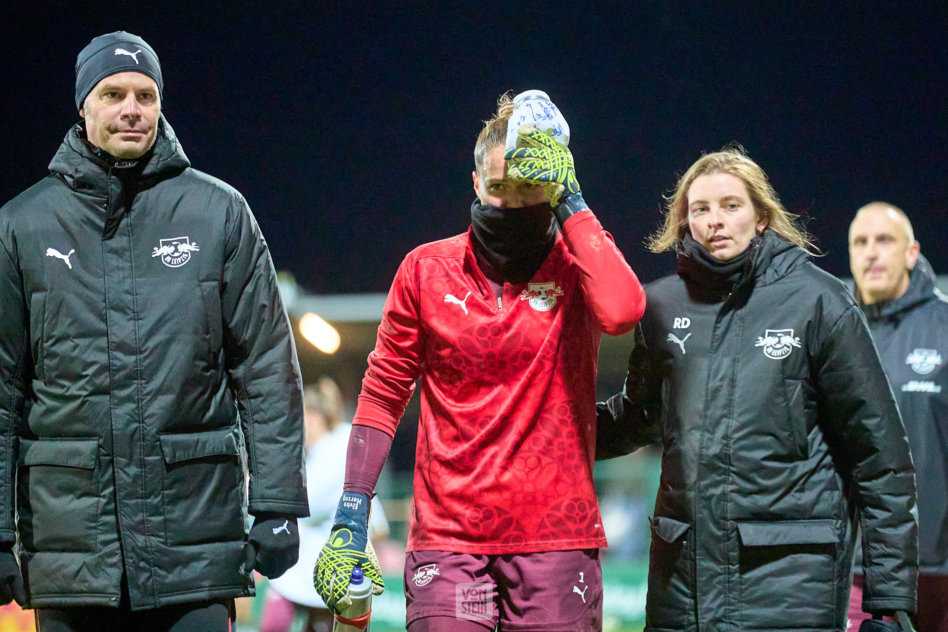 Elvira Herzog (1, RB Leipzig), bei der Erwärmung, Treffer im Gesicht, etwas benommen