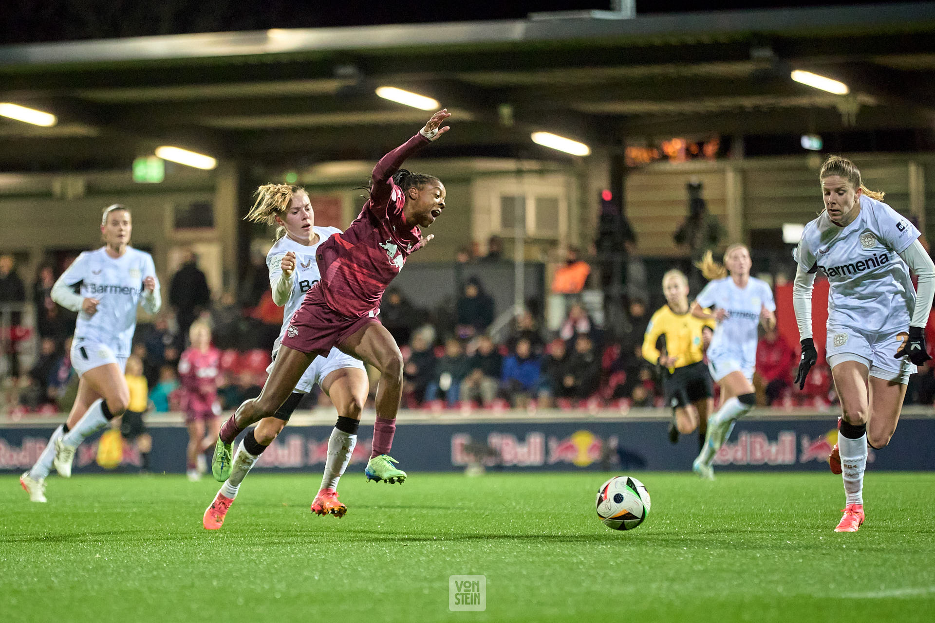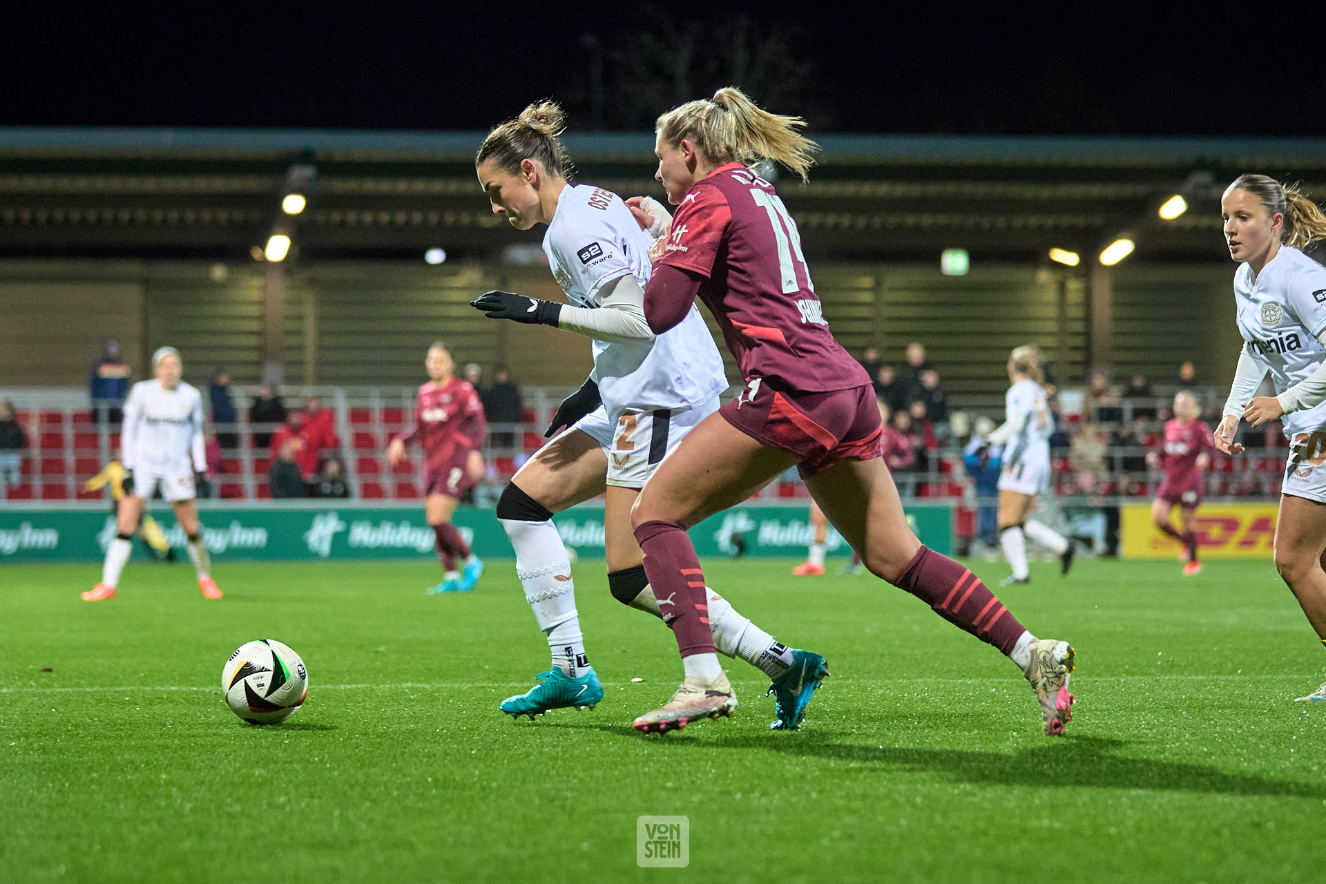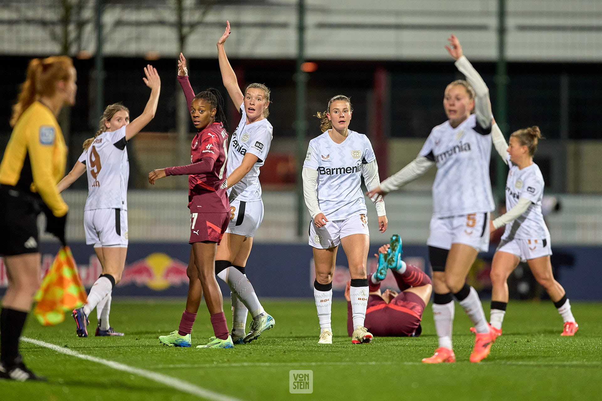 Janou Levels (5, Bayer Leverkusen) kümmert sich nach einem Zusammenprall um Karolina Lea Vilhjalmsdottir (18, Bayer Leverkusen)