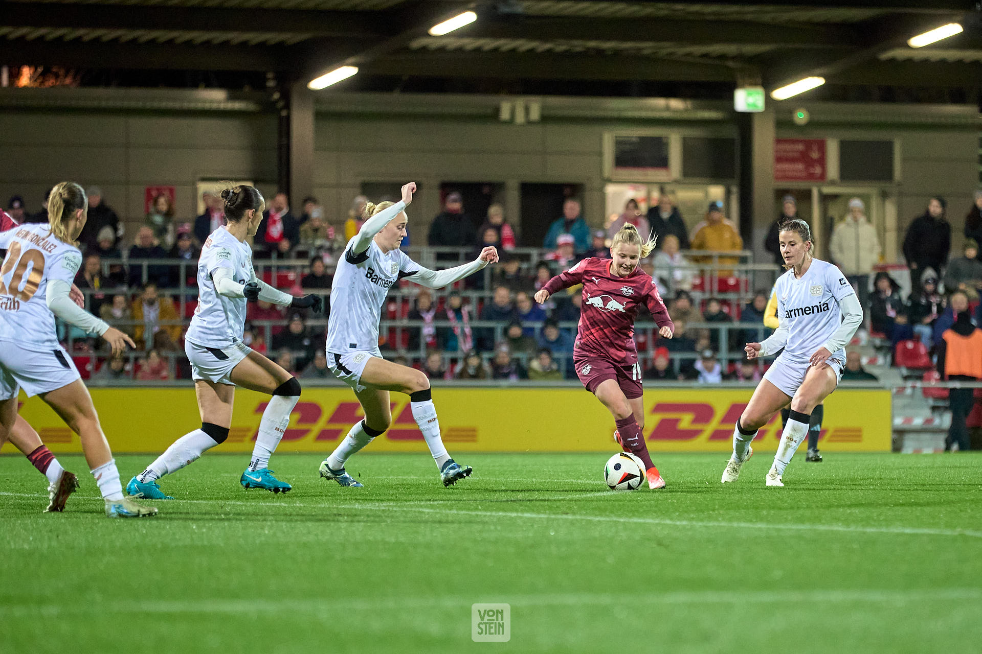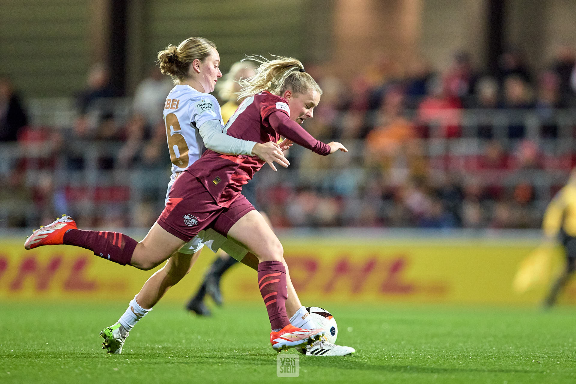 Marlene Müller (27, RB Leipzig), im Duell mit Karolina Lea Vilhjalmsdottir (18, Bayer Leverkusen), mit Ball