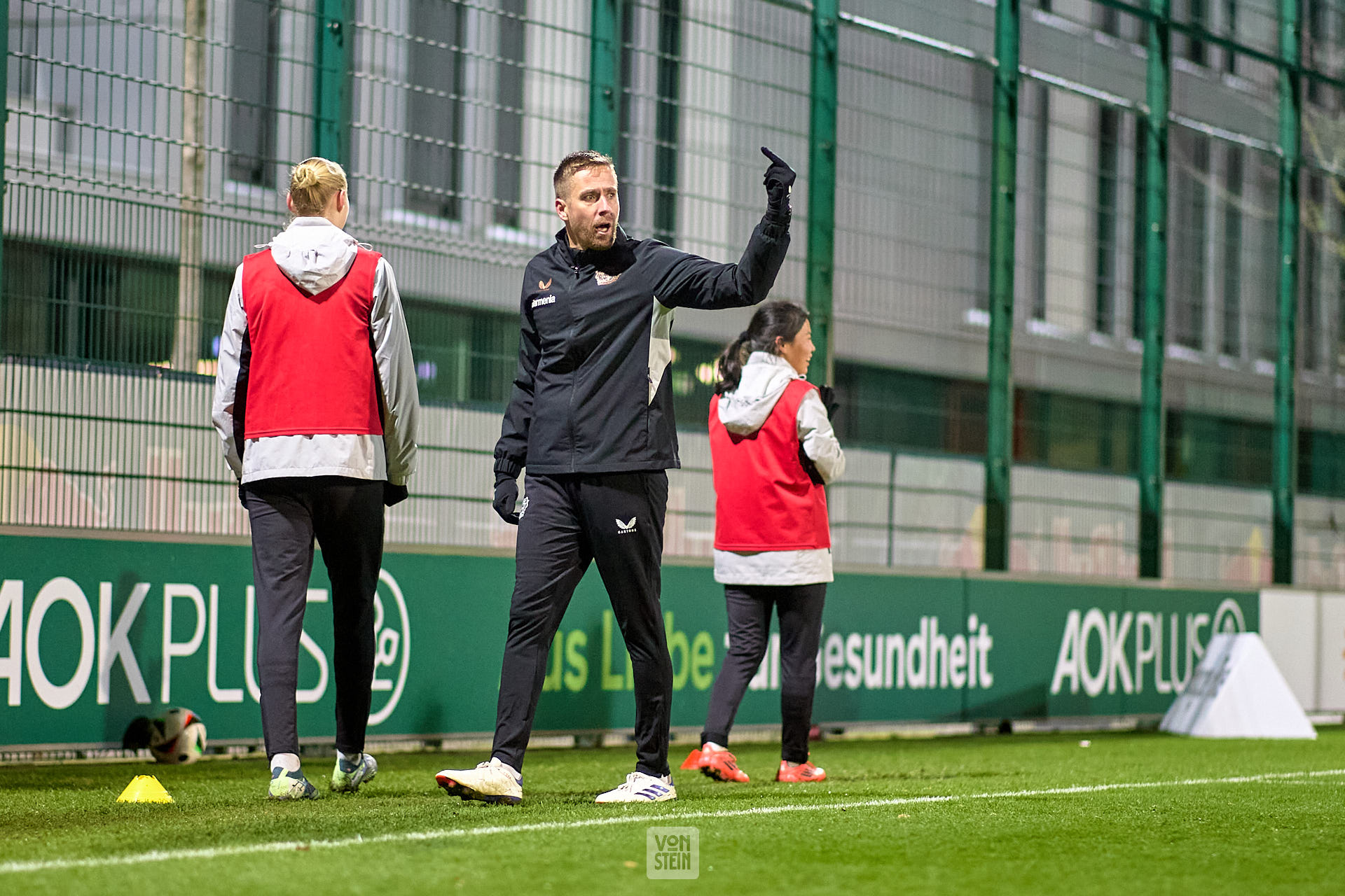 Maurice Mülder (Atlethiktrainer, Bayer Leverkusen), bejubelt das späte Tor seiner Mannschaft auf seine eigene Weise