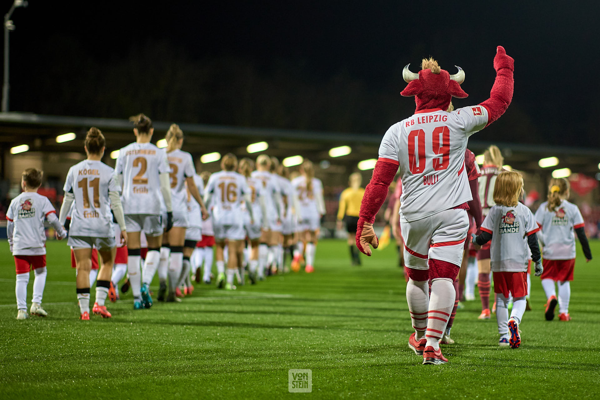 Die Mannschaften betreten den Platz, Einlaufen, mit Maskottchen Bulli