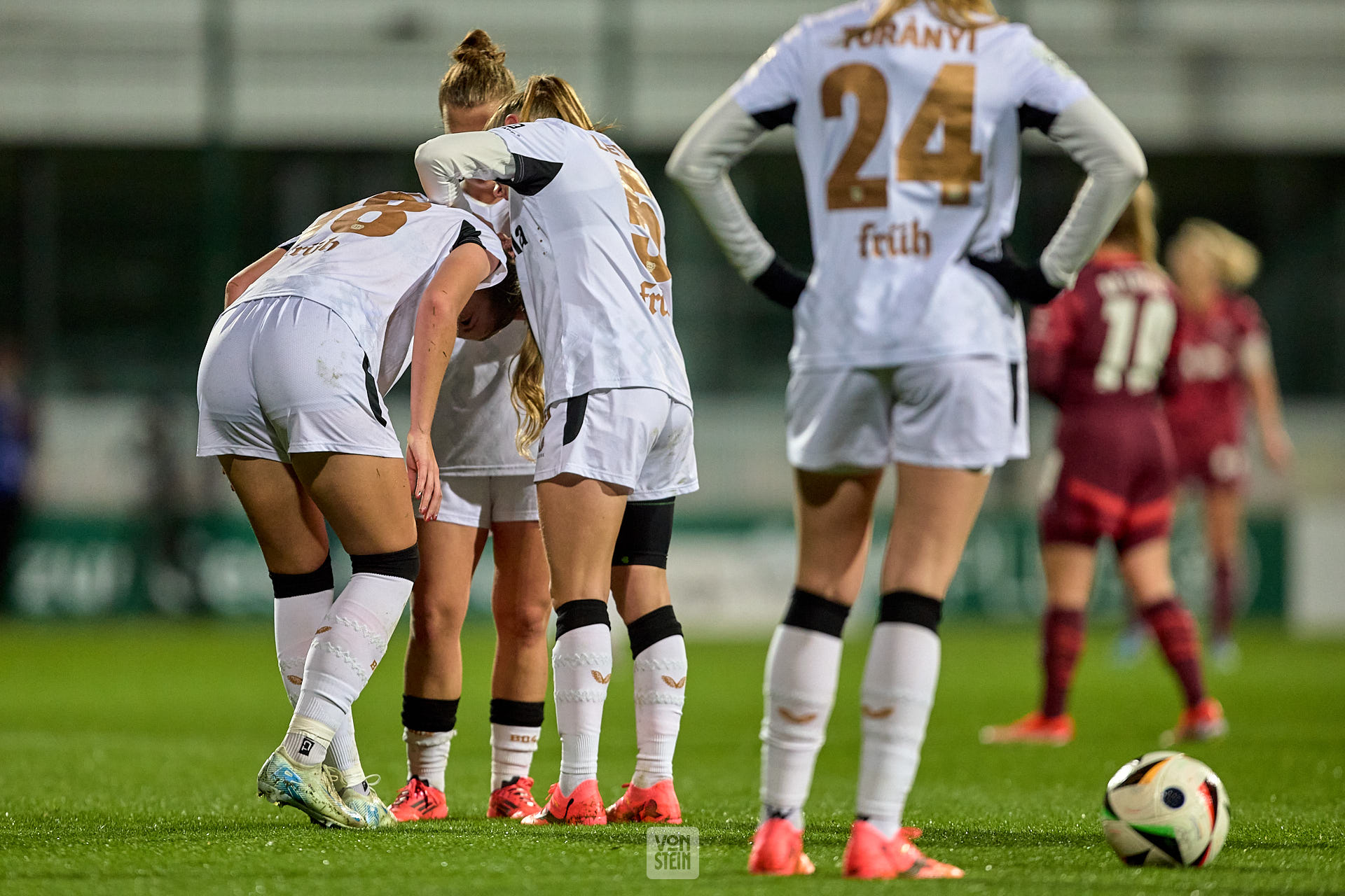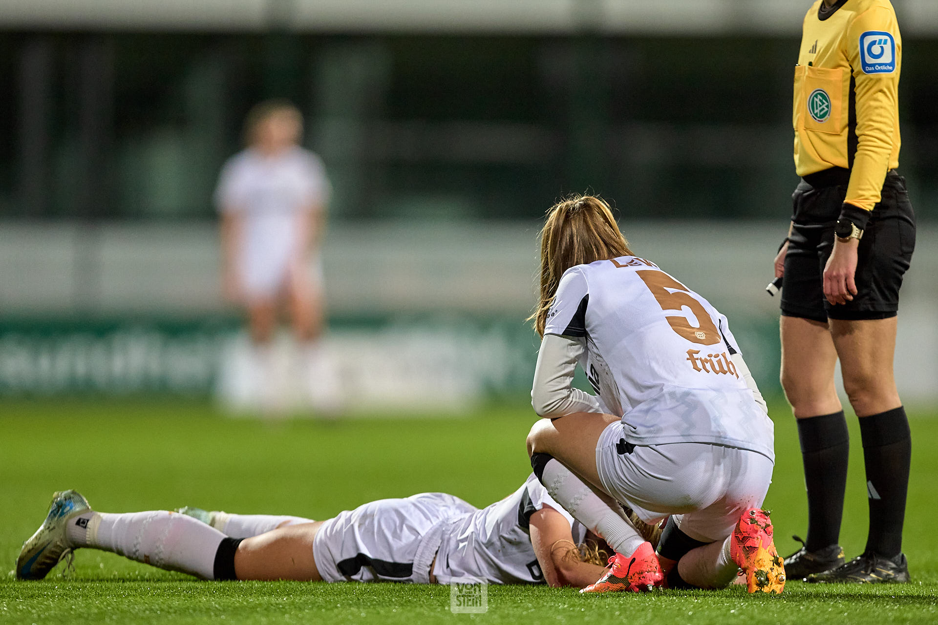 Janou Levels (5, Bayer Leverkusen) kümmert sich nach einem Zusammenprall um die verletzte Karolina Lea Vilhjalmsdottir (18, Bayer Leverkusen)