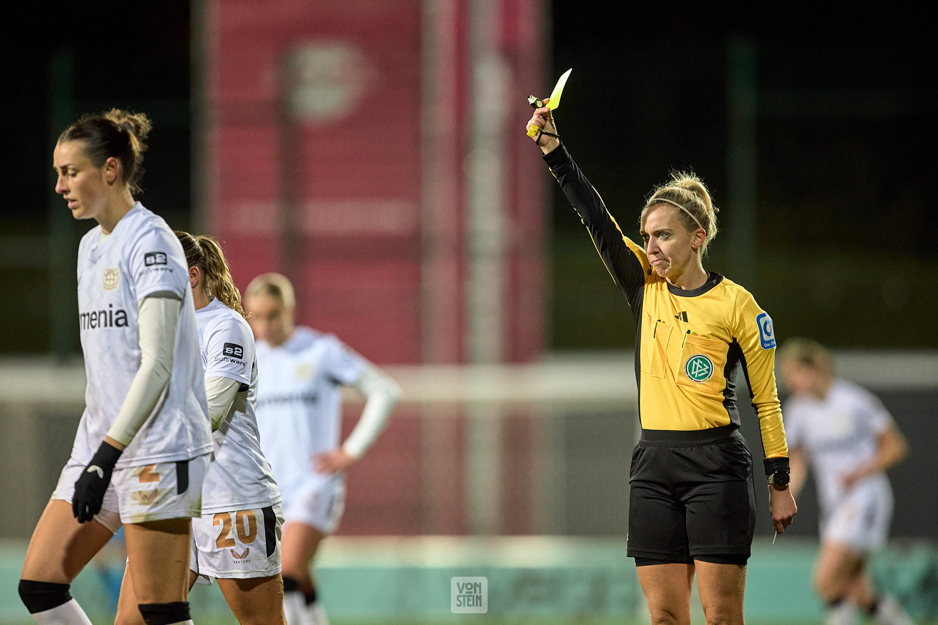 Schiedsrichterin Julia Boike zeigt Caroline Kehrer (9, Bayer Leverkusen) die gelbe Karte