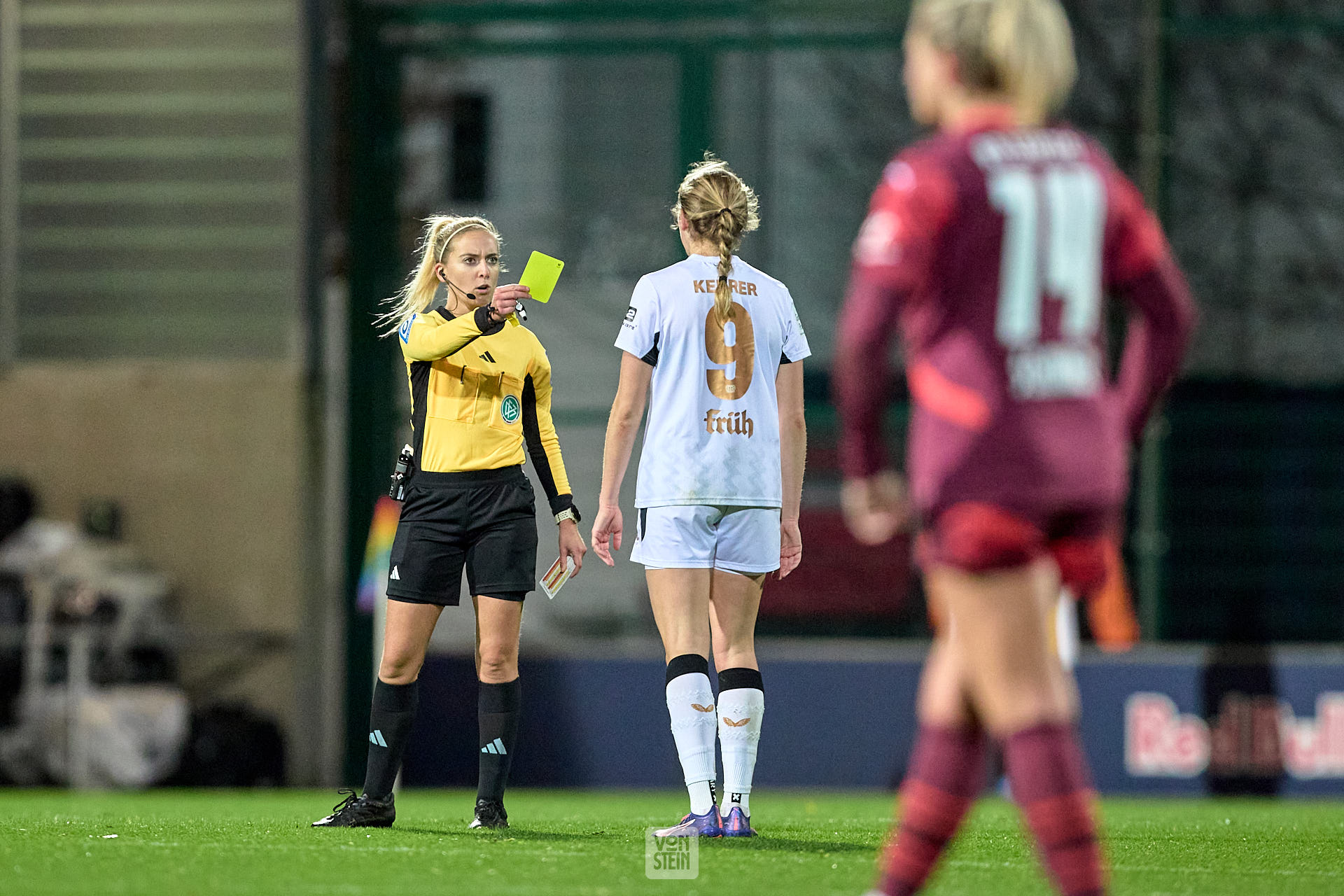 Schiedsrichterin Julia Boike zückt die gelbe Karte