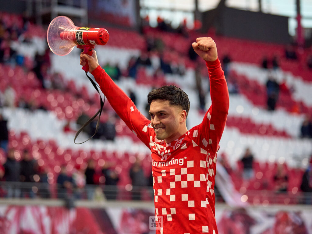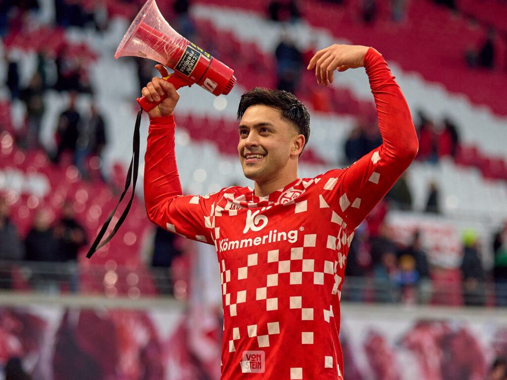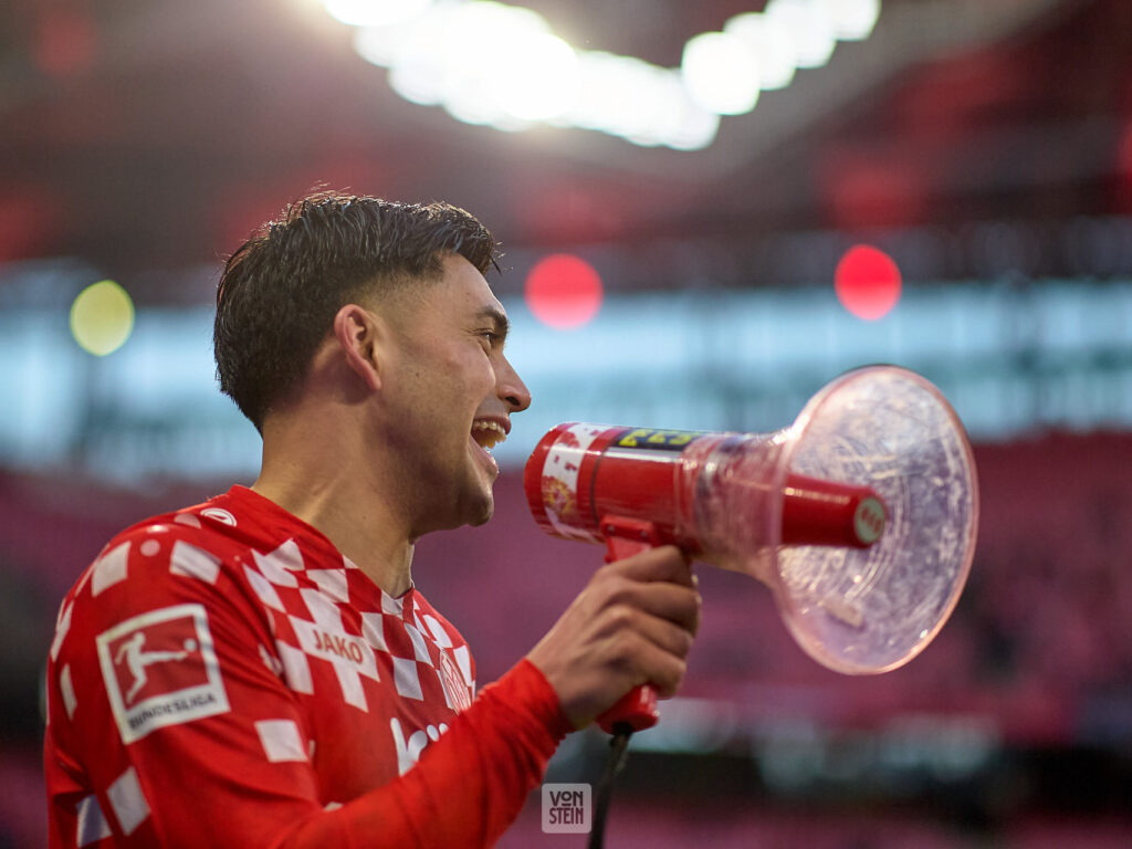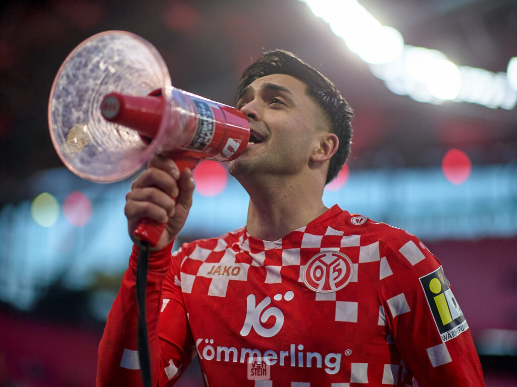 Nadiem Amiri (18, FSV Mainz 05), nach Sieg, mit Megafon