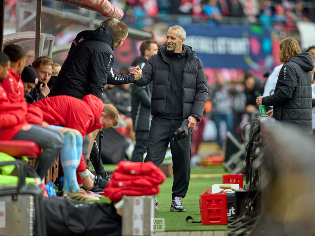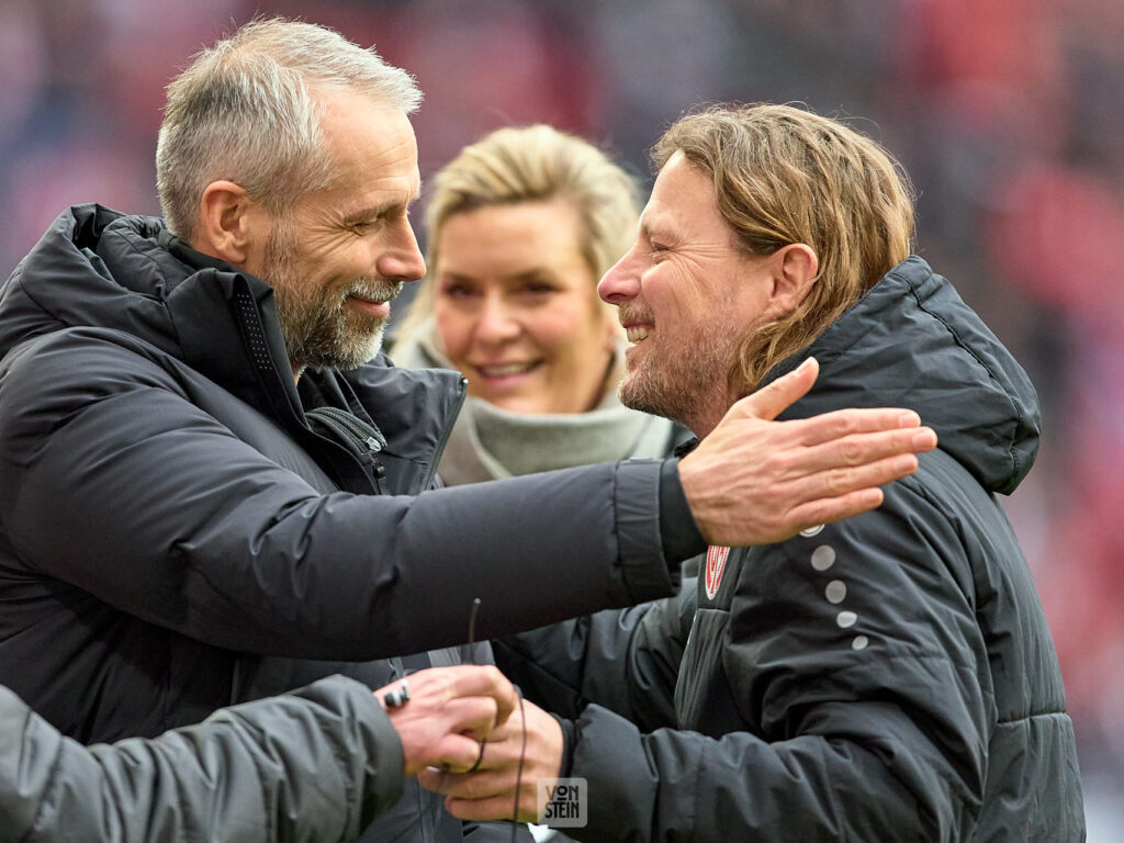 Marco Rose (Cheftrainer, RB Leipzig, li.), Bo Henriksen (Cheftrainer, FSV Mainz 05), beim Wechsel vor zwischen den Interviews, begrüßen sich