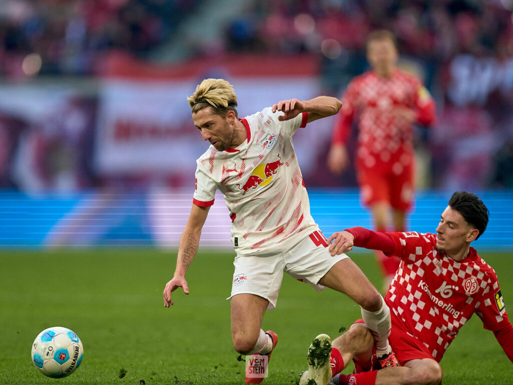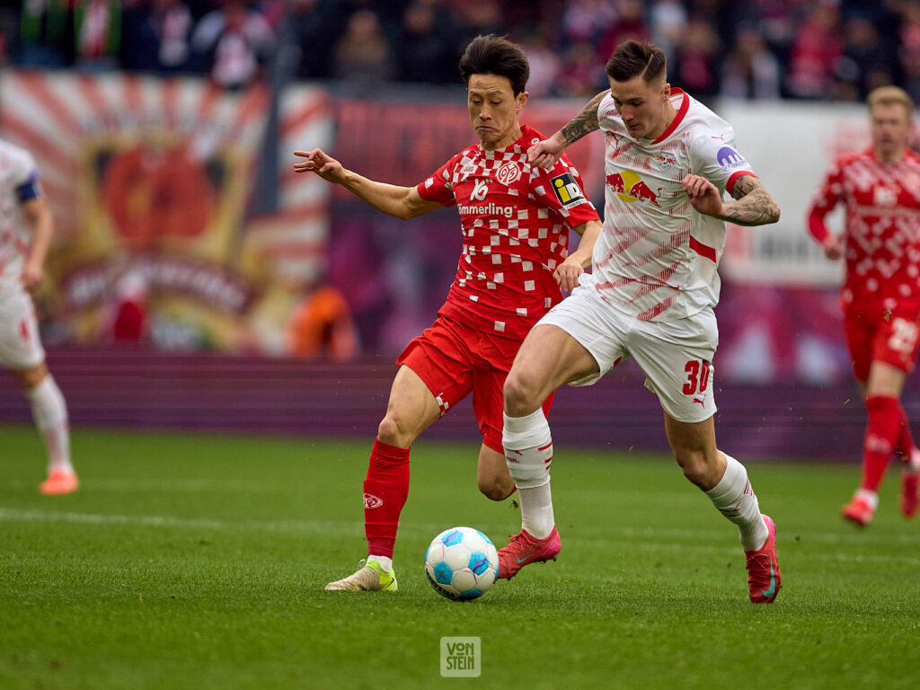 Jae-Sung Lee (7, FSV Mainz 05, li.), Benjamin Sesko (30, RB Leipzig), Aktion, Zweikampf um Ball, vorm Tor