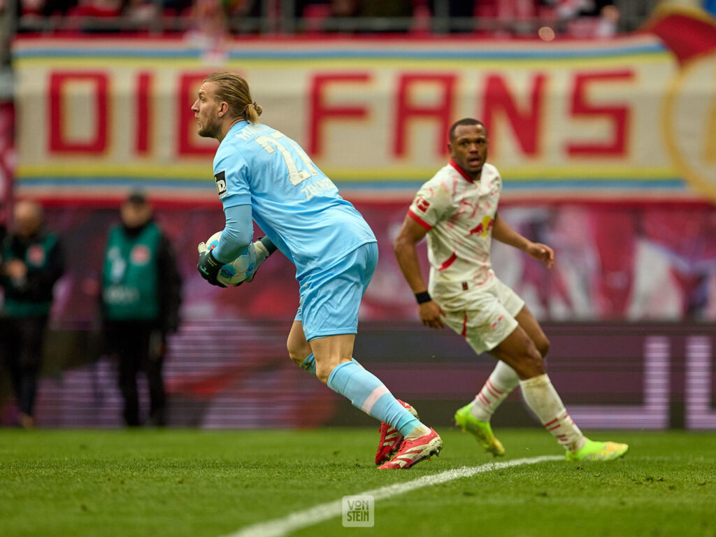 Robin Zentner (27, FSV Mainz 05) ist vor Lois Openda (11, RB Leipzig) am Ball, #fs