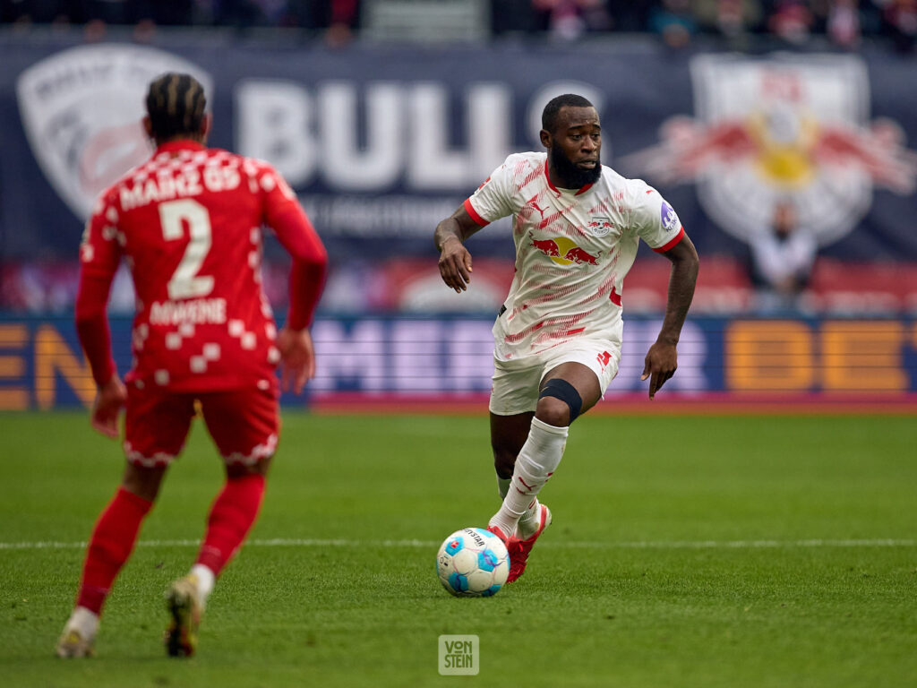 El Chadaille Bitshiabu (5, RB Leipzig), Freisteller, Aktion, mit Ball, Schuss