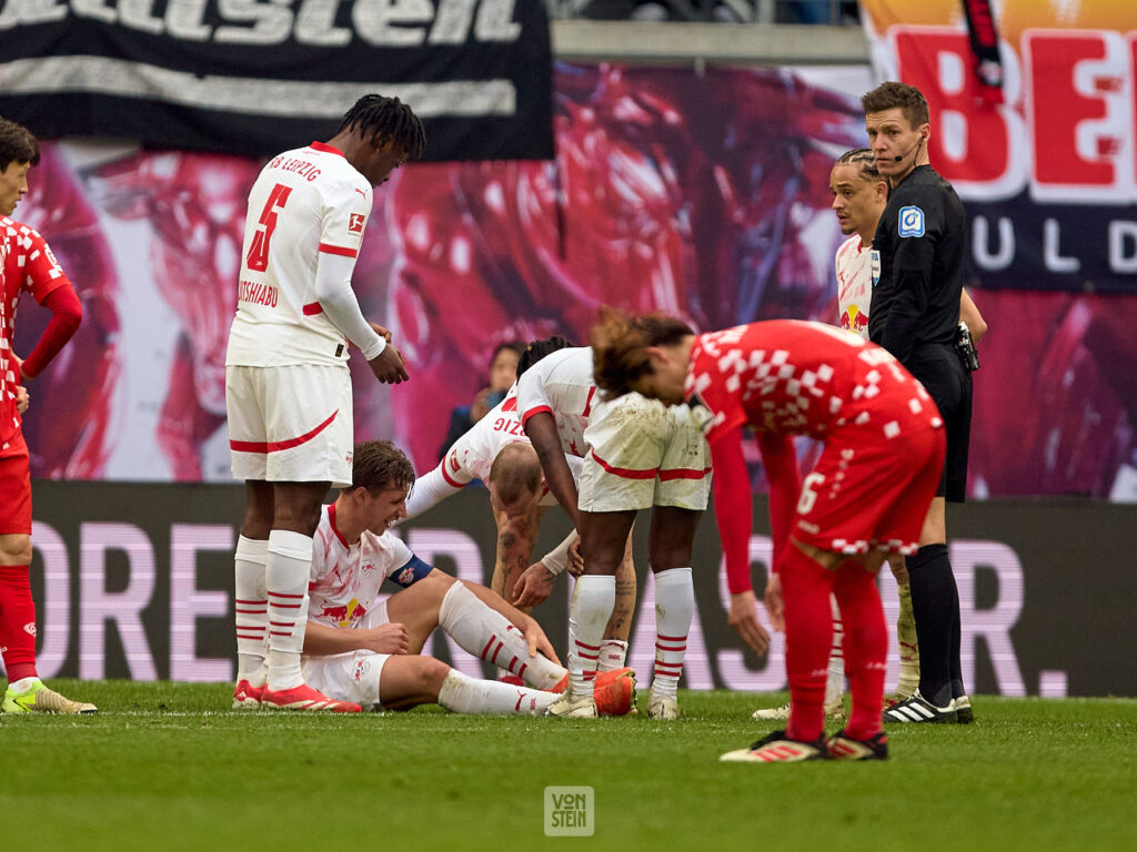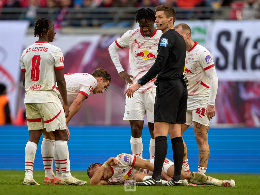 Lois Openda (11, RB Leipzig), gemeinschaftlich niedergerungen