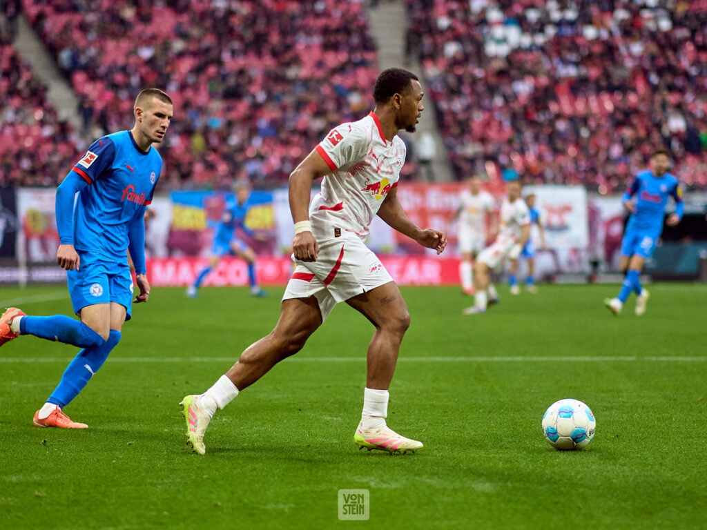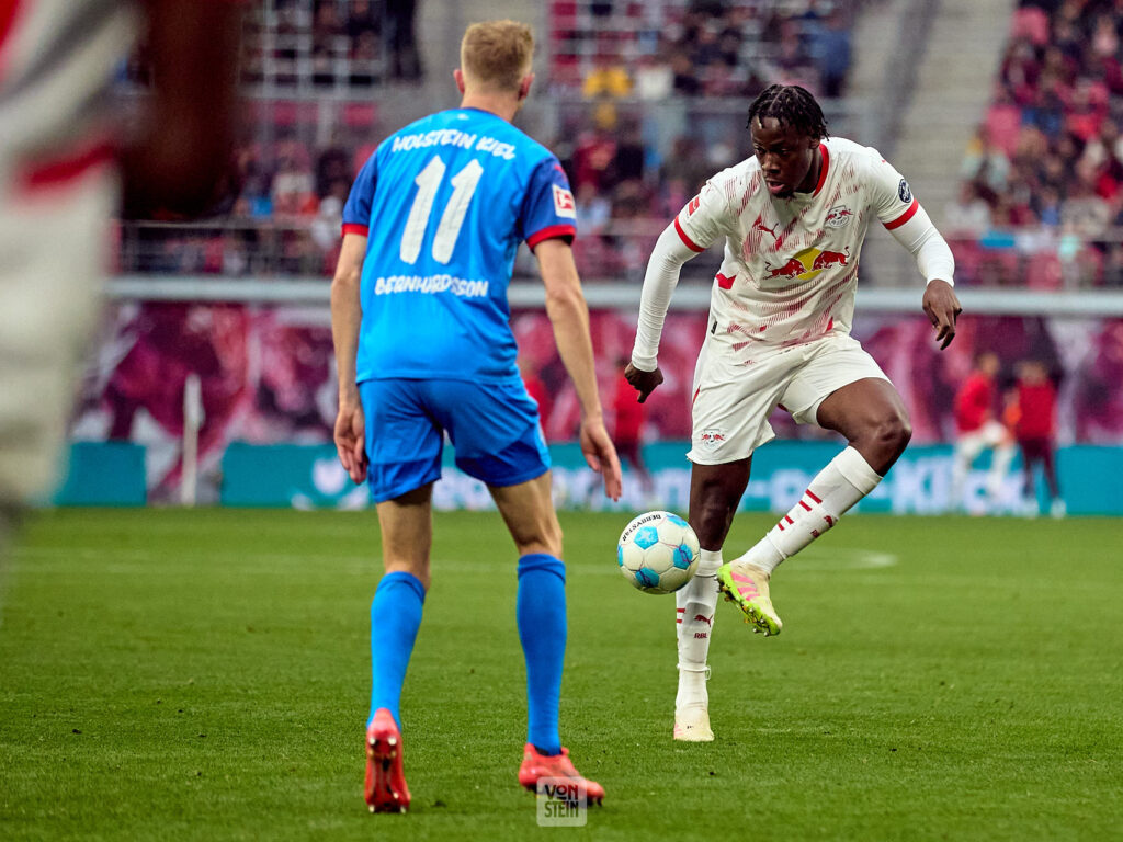 El Chadaille Bitshiabu (5, RB Leipzig), Freisteller, Aktion, mit Ball