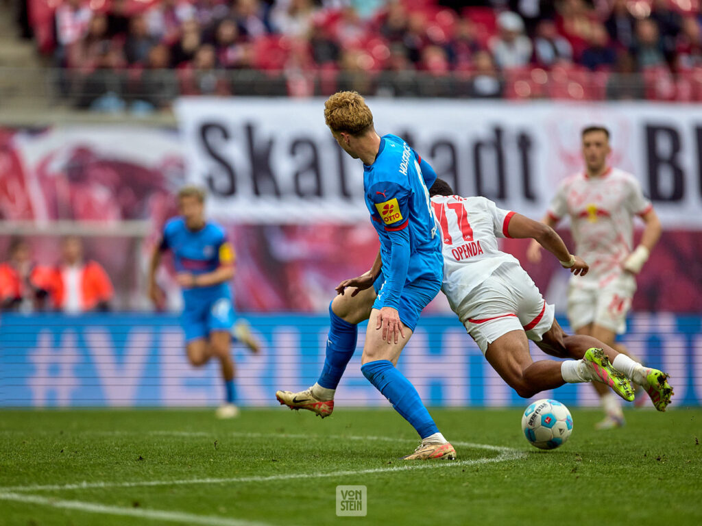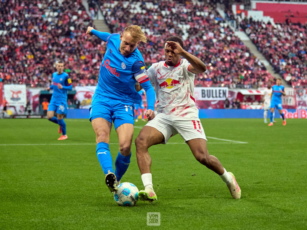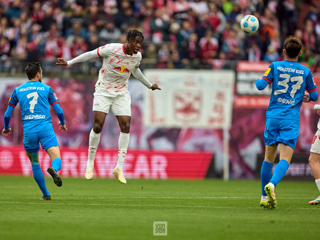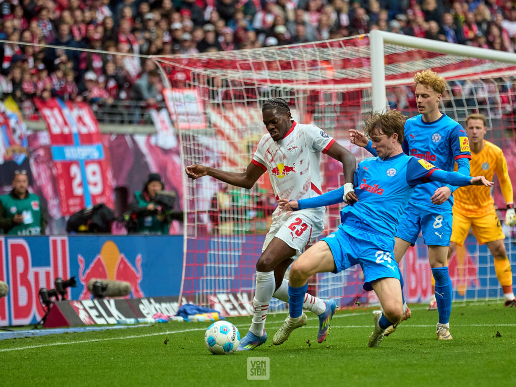 Castello Lukeba (23, RB Leipzig, li.), Magnus Knudsen (24, Holstein Kiel), Aktion, Zweikampf um Ball, im Strafraum