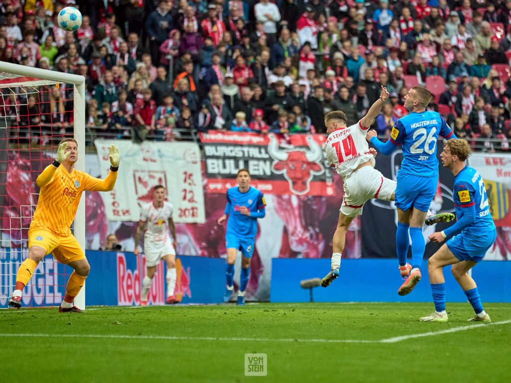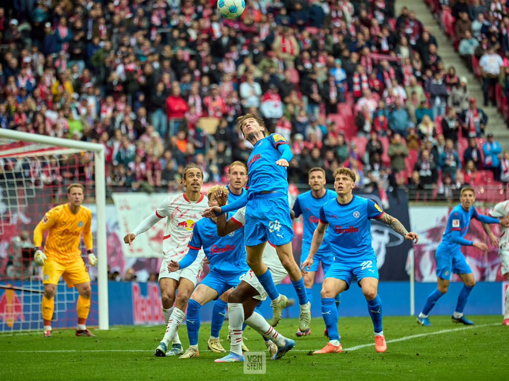 Marko Ivezic (6, Holstein Kiel), Benjamin Sesko (30, RB Leipzig) im Kopfballduell, Aktion, im Sprung
