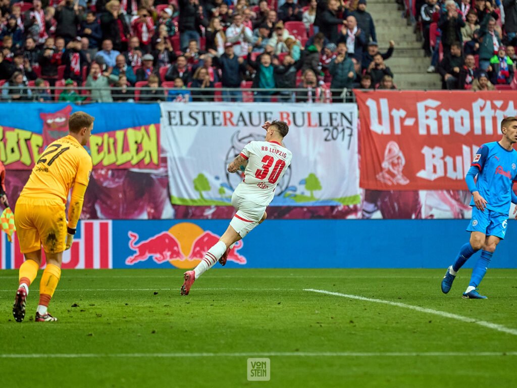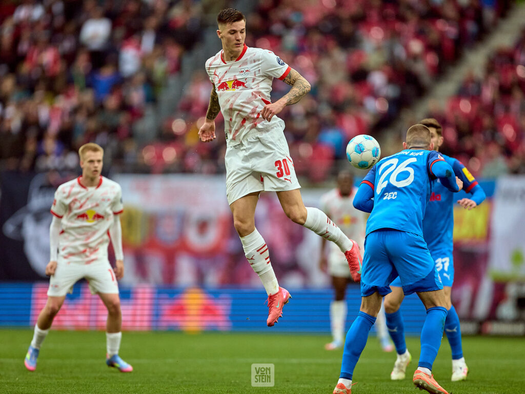 Benjamin Sesko (30, RB Leipzig), Freisteller, im Sprung, Blick auf Ball