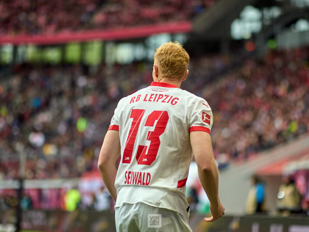Nicolas Seiwald (13, RB Leipzig), Rückansicht, Stadion mit Fans im Hintergrund