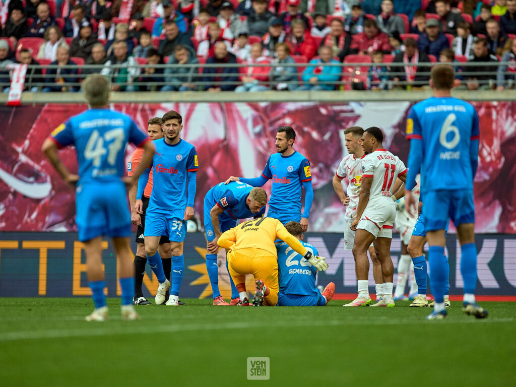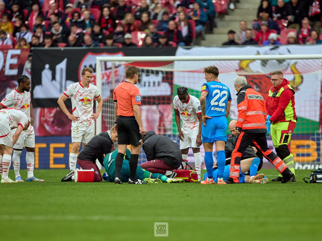Behandlung auf dem Platz nach Zusammenprall von Peter Gulacsi (1, RB Leipzig) und David Zec (26, Holstein Kiel)