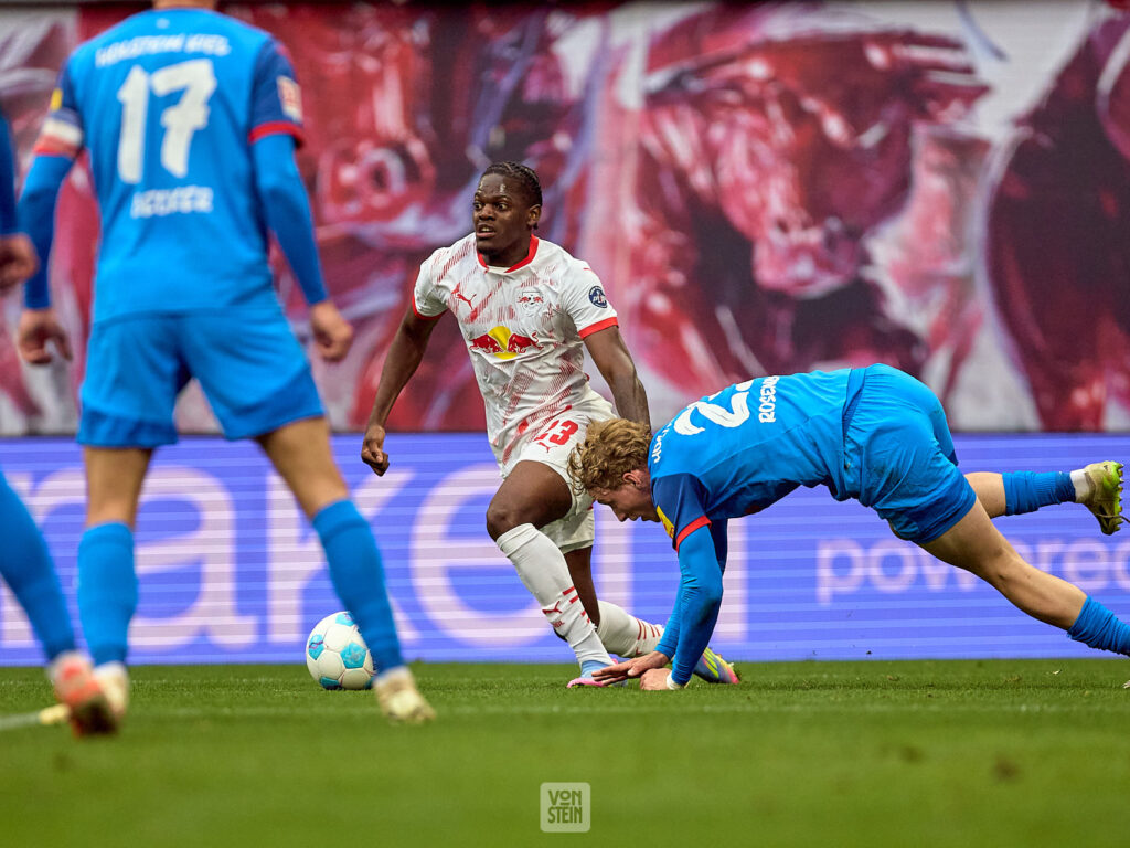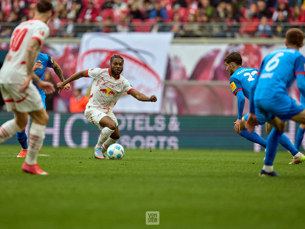 Castello Lukeba (23, RB Leipzig), Aktion, mit Ball, umdribbelt Gegner