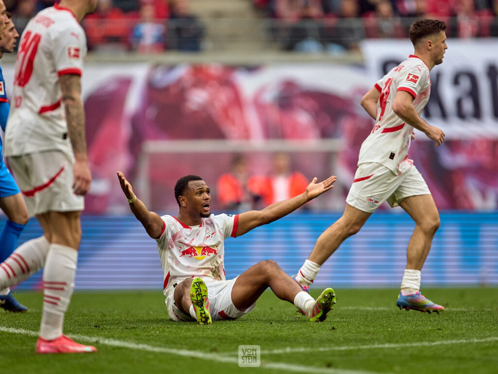 Lois Openda (11, RB Leipzig), gestikuliert, sitzt am Boden, vermisst den Pfiff