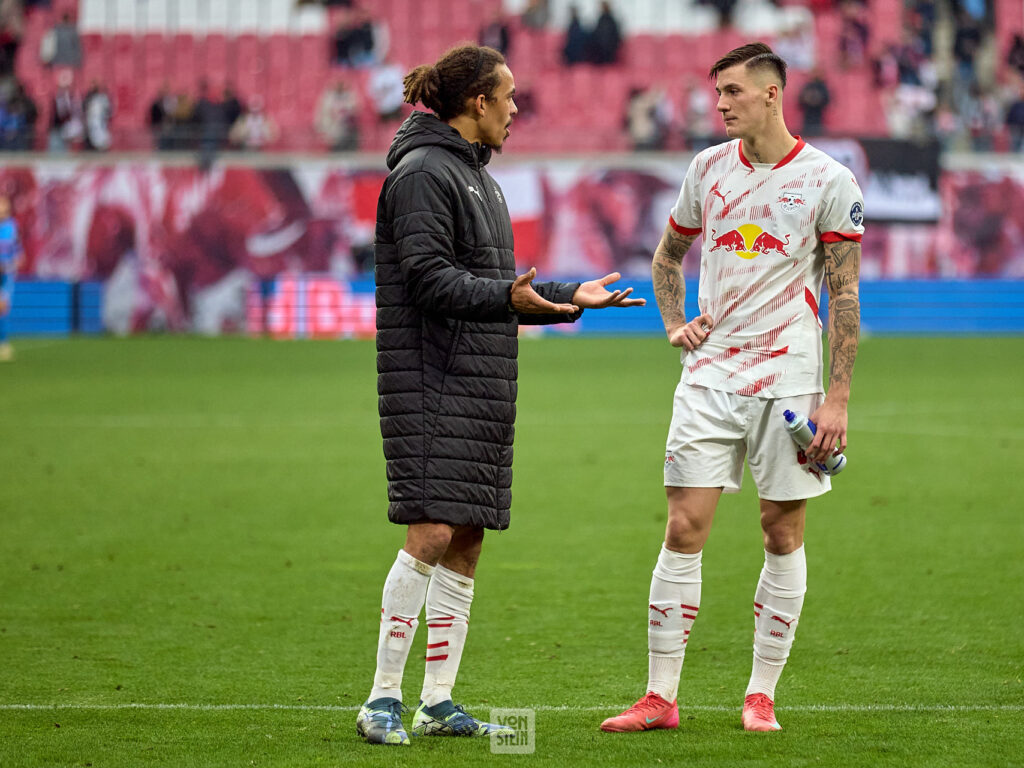 Yussuf Poulsen (9, RB Leipzig, li.) und Benjamin Sesko (30, RB Leipzig) fachsimpeln nach Abpfiff