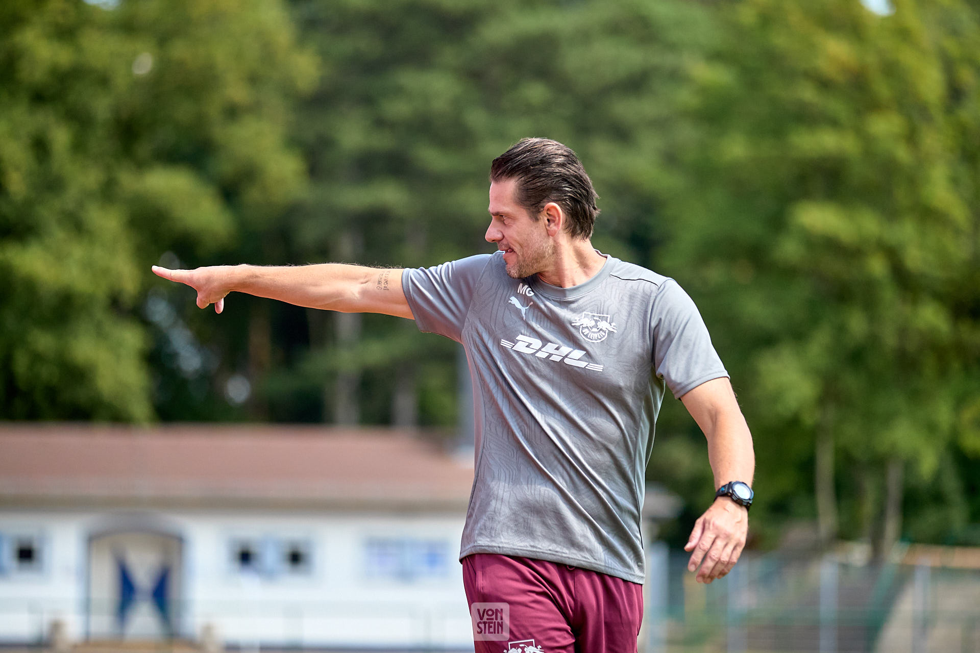 Michael Gurski (Torwarttrainer, RB Leipzig), zeigt zur Seite