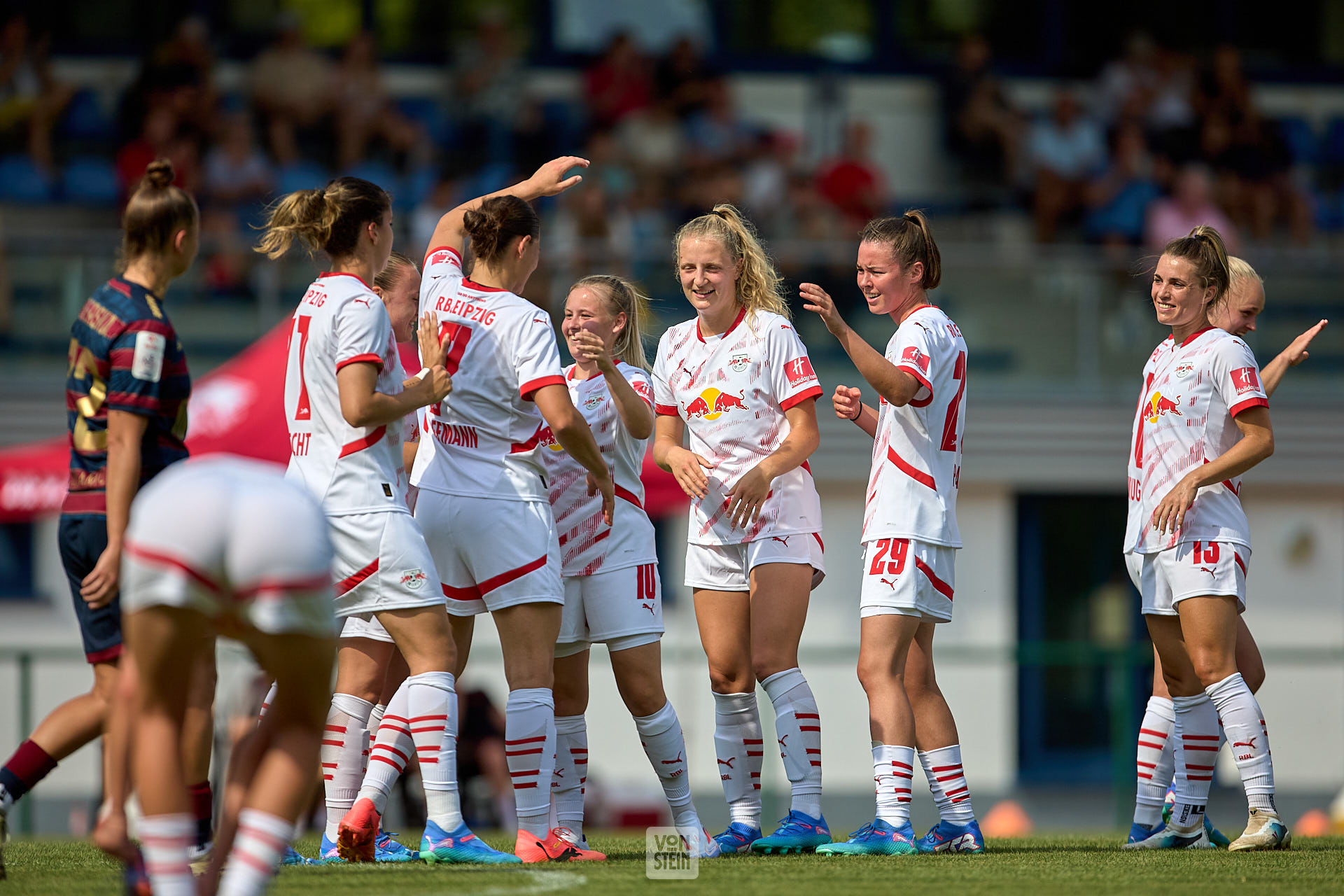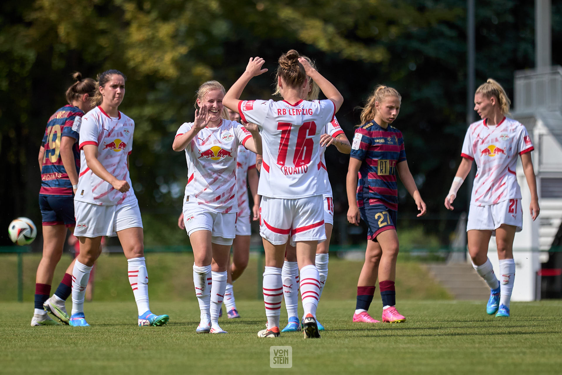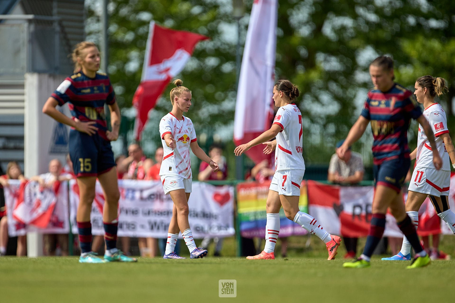 Marlene Müller (27, RB Leipzig, li.), Giovanna Hoffmann (7, RB Leipzig), Abklatschen nach Tor, vor Fans