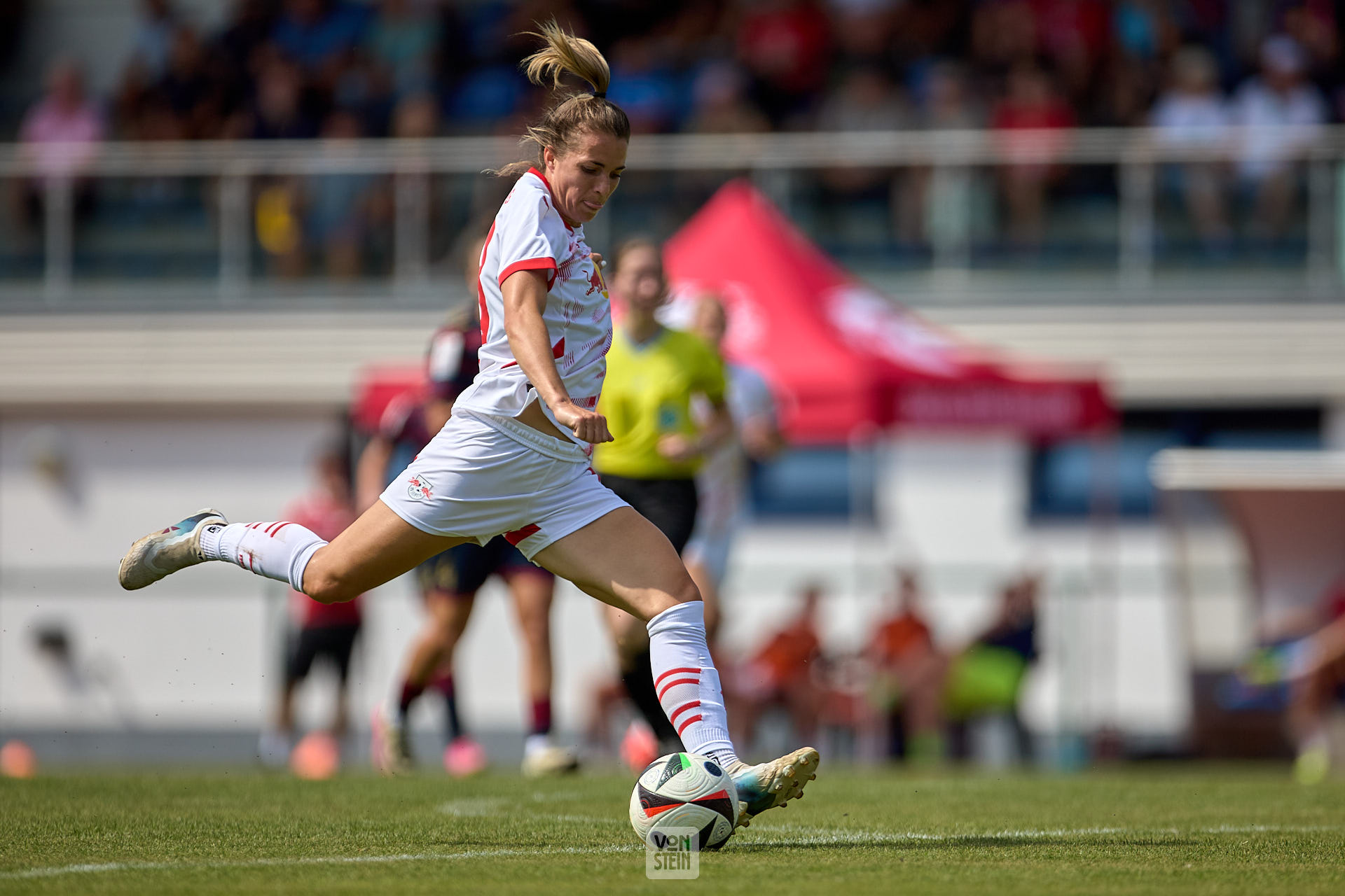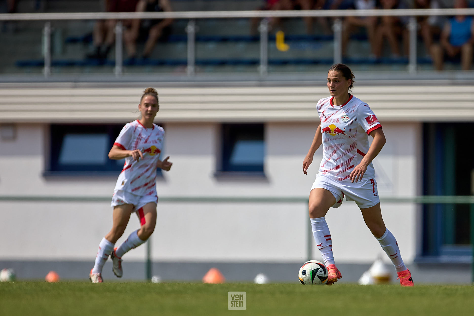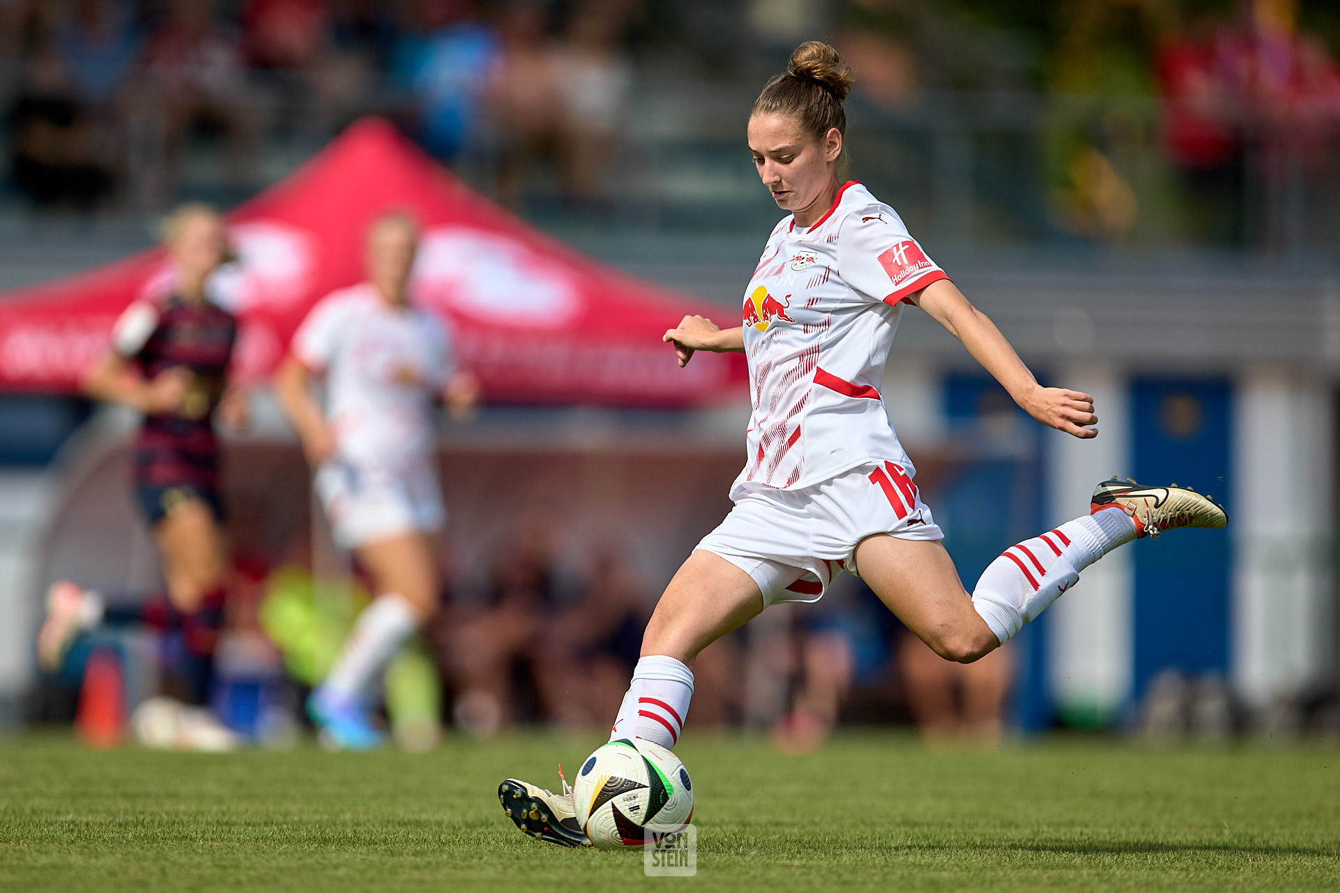 Julia Landenberger (21, RB Leipzig), Freisteller, Aktion, mit Ball, Rückansicht, Tribüne im Hintergrund