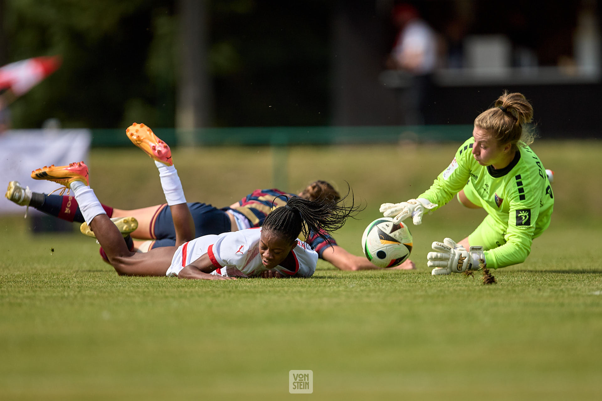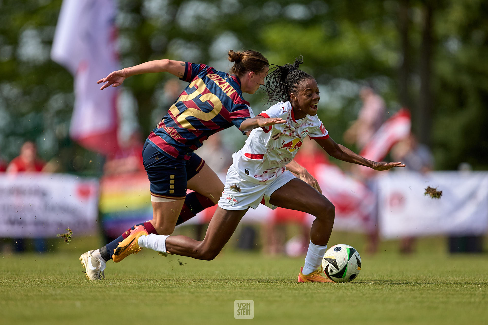 Lydia Andrade (17, RB Leipzig), Foul im Strafraum, fliegendes Gras, mit Ball