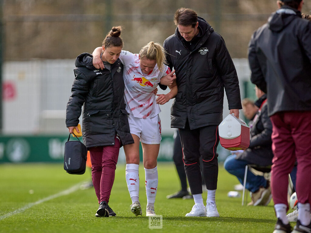Marleen Schimmer (14, RB Leipzig), muss verletzt vom Platz, gestützt
