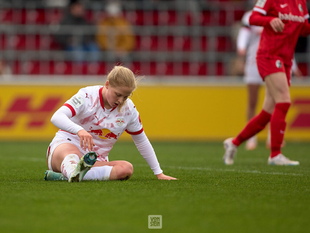 Emilia Asgeirsdottir (8, RB Leipzig), sitzt am Boden, Torschuss gehalten, unzufrieden