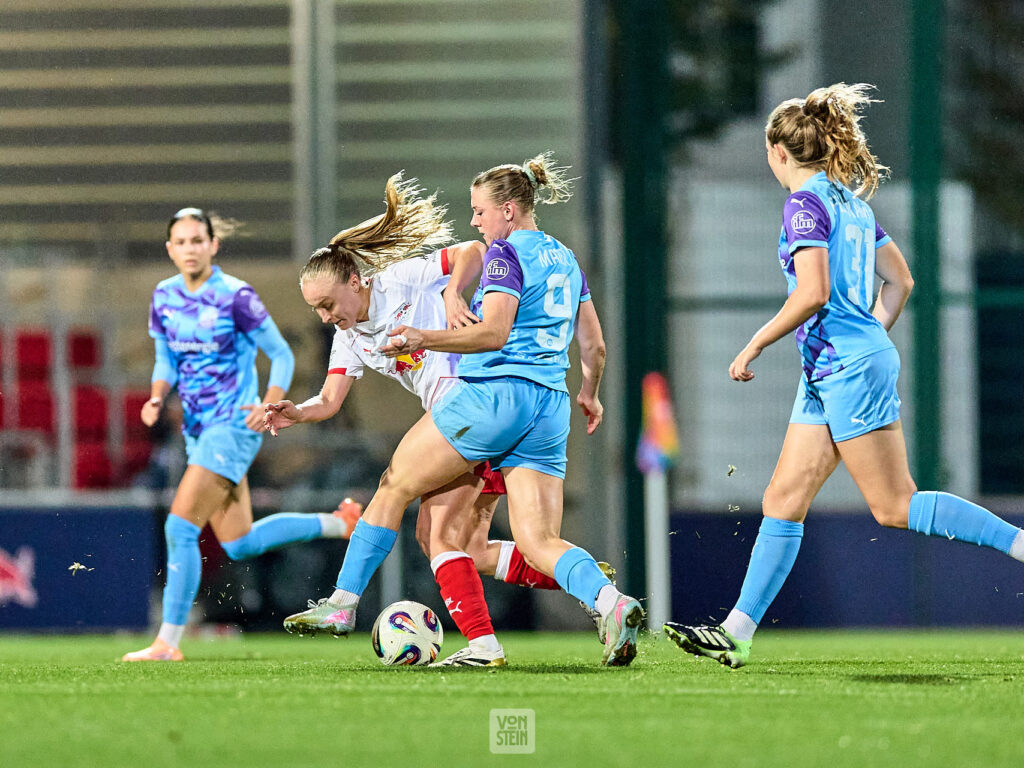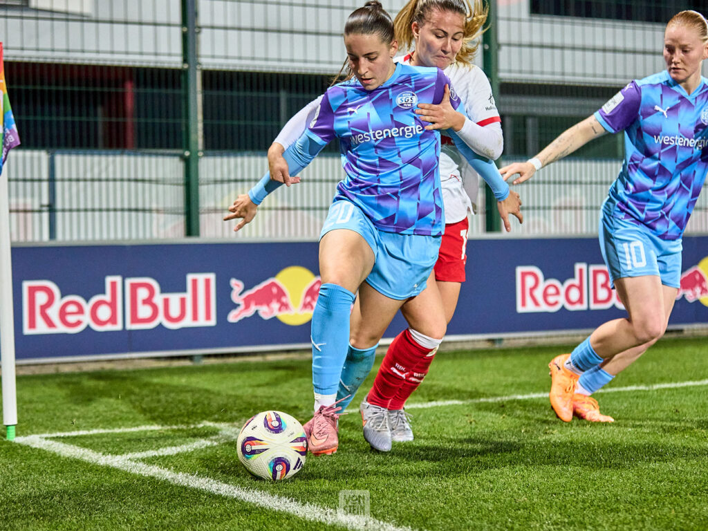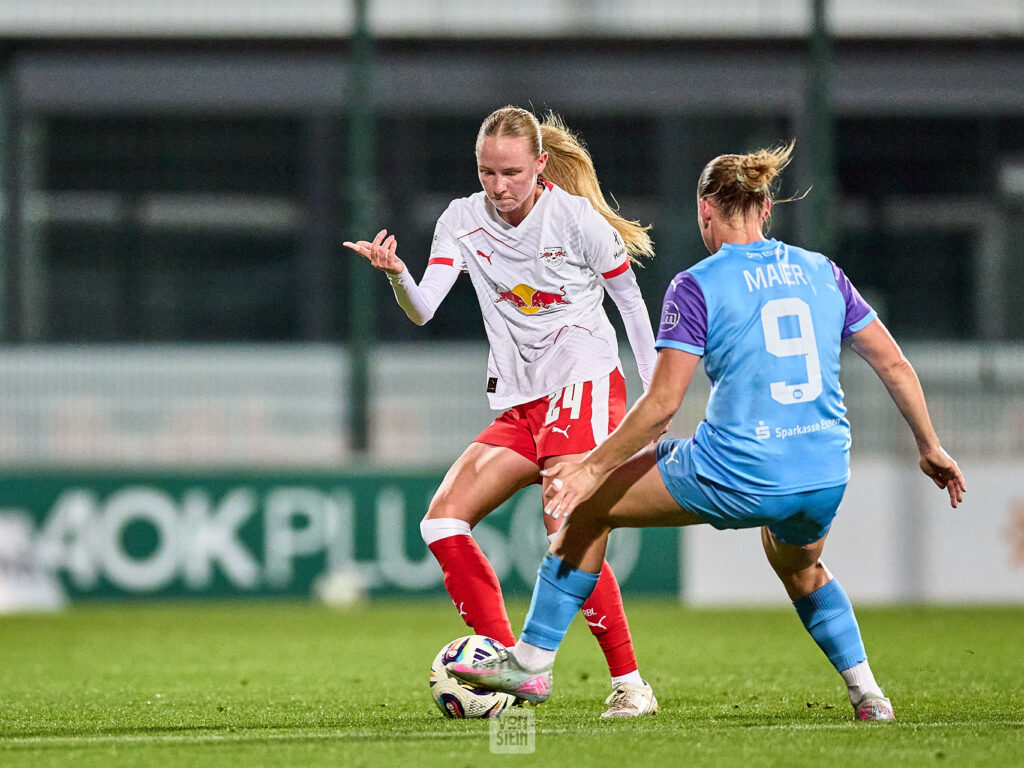 Nikoline Dudek (24, RB Leipzig, li.), Ramona Maier (9, SGS Essen), Aktion, Zweikampf um Ball