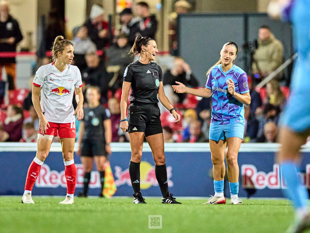 Schiedsrichterin Nadine Westerhoff, Laureta Elmazi (11, SGS Essen) hebt die Hände, Pfiff erklärt
