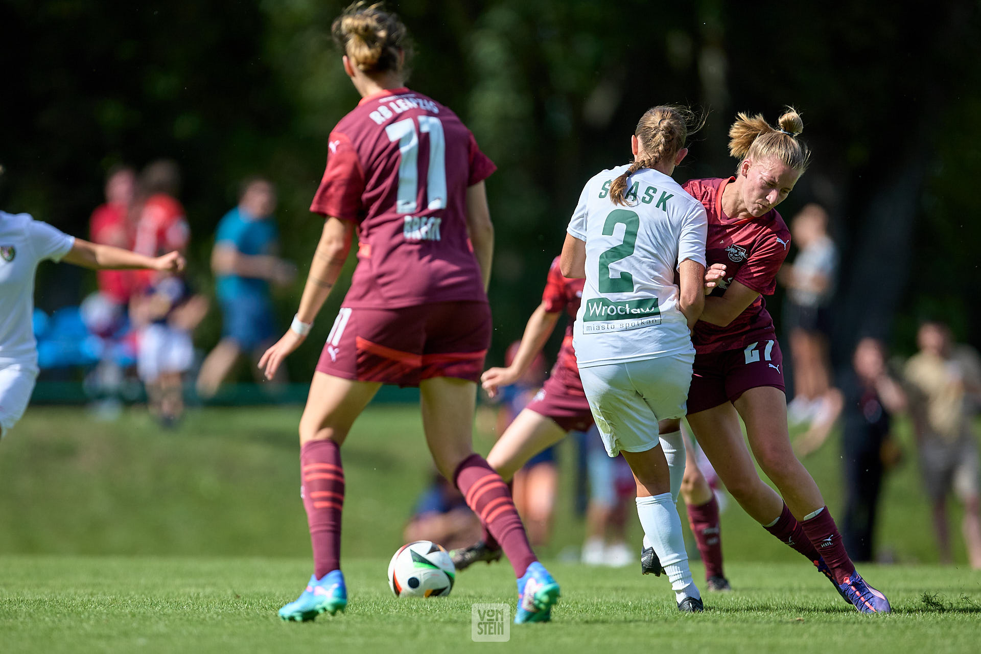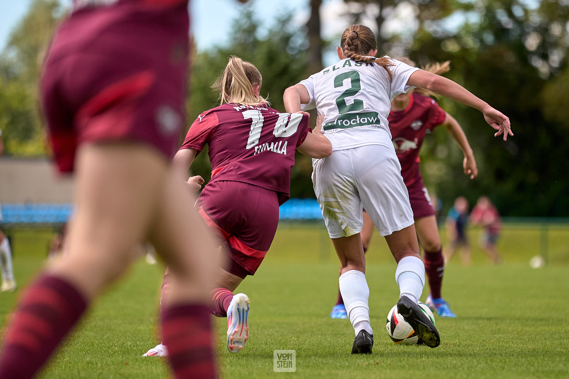 Vanessa Fudalla (10, RB Leipzig, li.), Berry Ostrowska (2, Slask Wroclaw), Rückansicht, Zweikampf um Ball