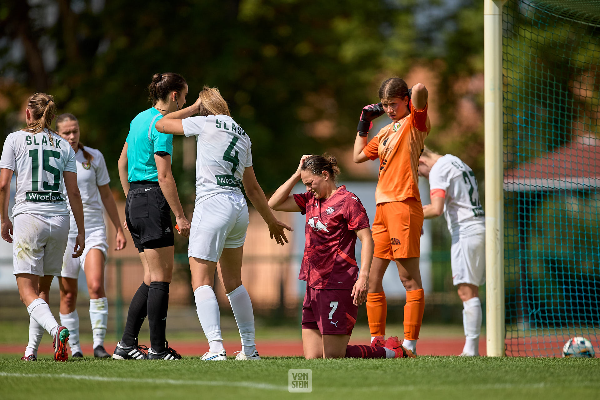 Giovanna Hoffmann (7, RB Leipzig), hält sich nach Zusammenprall den Kopf
