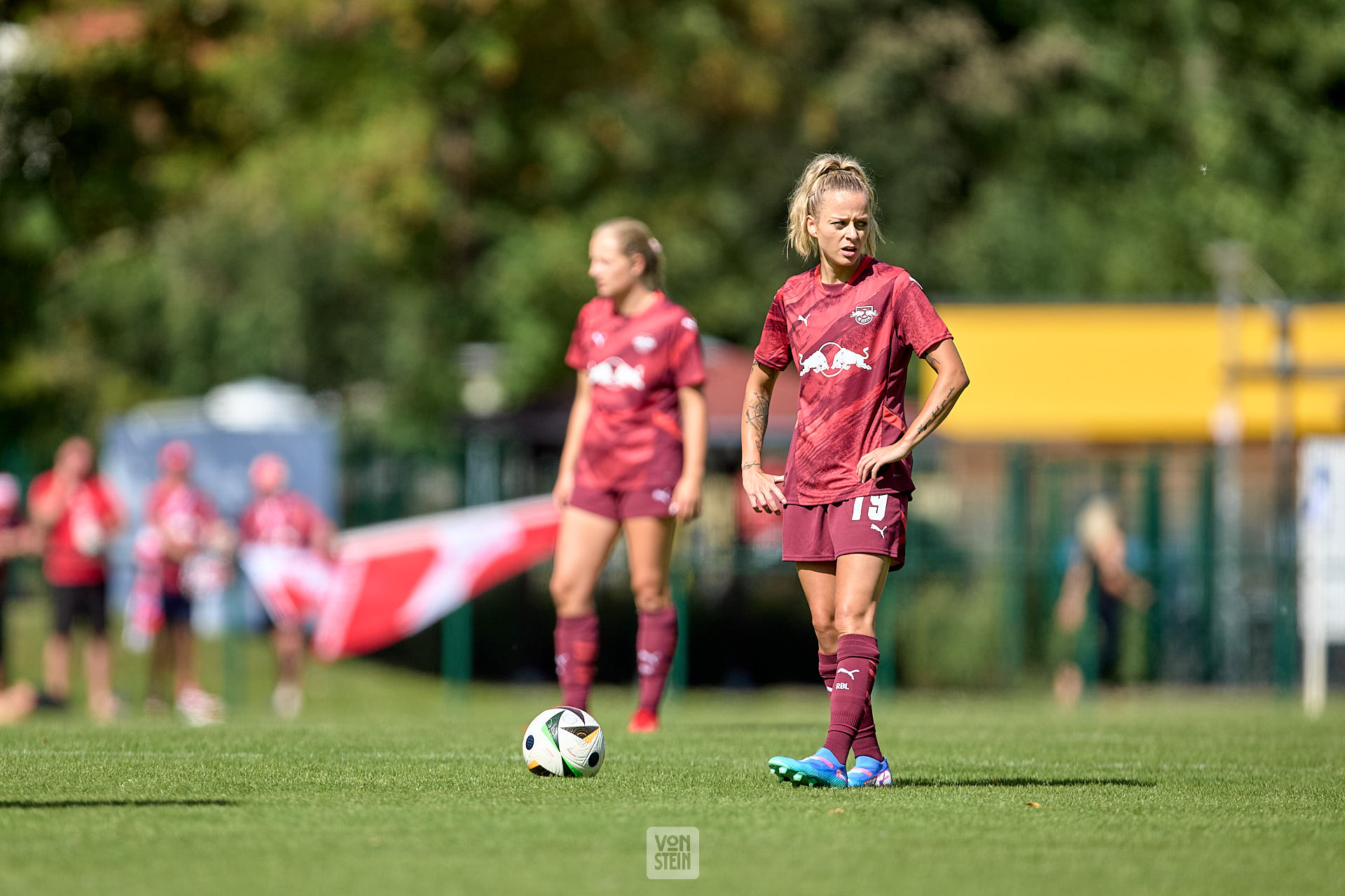 Jenny Hipp (19, RB Leipzig), Freisteller, vor einem Freistoß, Blick zur Seite, Hände in den Hüften